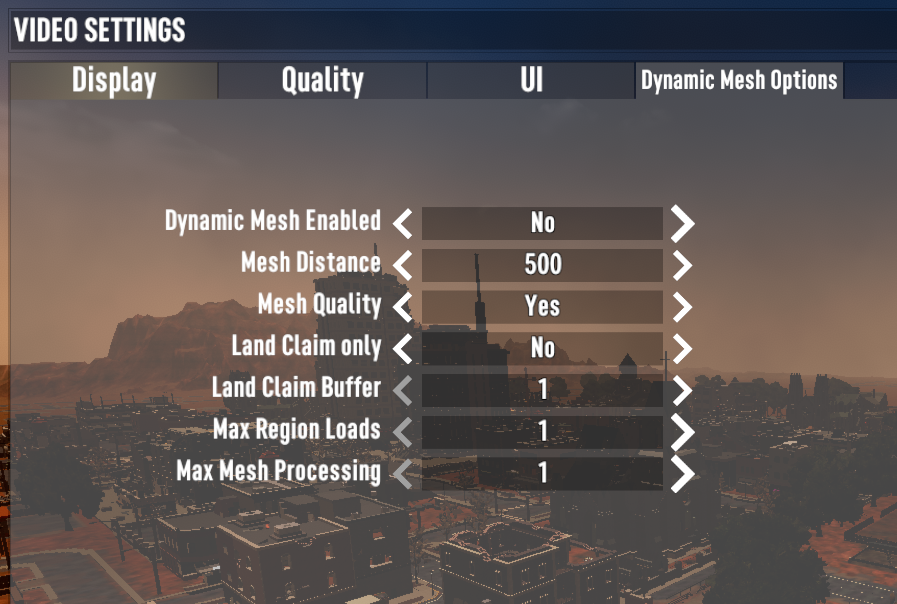 When I had get-go heard that Blastoff 20 released, I was ecstatic about trying out all the new features implemented; especially the new and improved world generation. It was much to my dismay when I faced extremely annoying and downright unplayable framerates within and around cities (and even towns for that matter) during my testing despite running the game flawlessly previously in the same session. At times I'd accept perfect frames despite an entire metropolis's LODs being rendered, while at other times my framerate tanked below even the double digits despite previously running it quite well. The only fix I had found was reloading my save one time the framerate had gotten bad enough, which typically wouldn't take too long later on loading upwardly a relieve. At starting time I had assumed this was associated with some sort of resources leak due to the trouble'due south consistent buildup from zero to a hundred percent every fourth dimension I tested information technology, especially since the consequence persisted throughout all graphics configurations I had tried, but eventually found the true crusade of the issue; it was the new dynamic mesh system implemented in the alpha 20 update, which completely tanks the framerate when cities (and towns/POIs in full general for that matter) are slowly 'cached', for lack of a better term. Afterwards playing around with the dynamic mesh settings, fixing the outcome, and seeing countless other people experience the outcome through posts on the reddit and discord, I decided to make this guide showing the fix I establish. The next section volition outline the change you need to make (In game, no registry and config file edits hither!) to fix the FPS trouble.